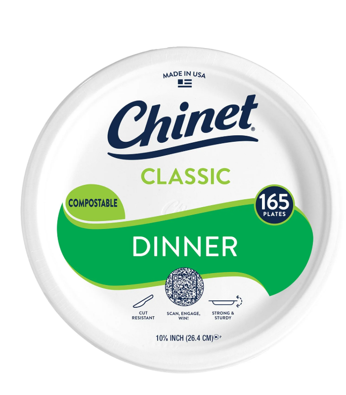 Chinet Classic Dinner Paper Plates, 10.375", 165 ct. are plates are resistant to leaks, cracks, tears and cuts to keep your food on your plate and not in your lap. Even better, they are made with compostable recycled materials.