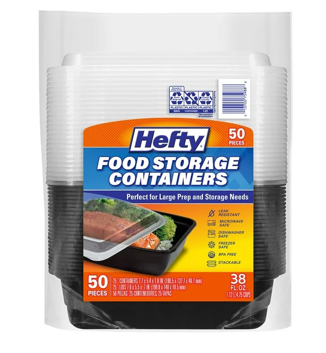 Hefty Plastic Food Storage Containers with Lids are made with reliable Hefty strength and are perfect for prepping and storing food for on-the-go or sending guests home with leftovers. Prep and transport your meals with confidence thanks to the leak-resistant lids and BPA-free materials. These sturdy food containers can store all kinds of delicious meals, including pasta dishes, rice-based meals, salads, protein and more! Pack more food with these 38-oz. Hefty Plastic Food Storage Containers that come with 25 containers and 25 lids.