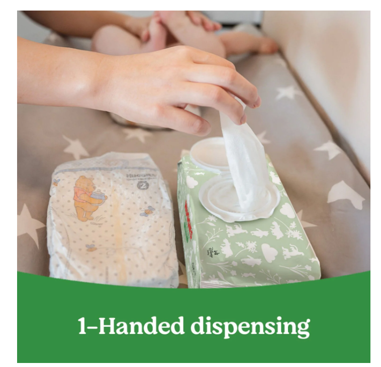 The wipes come in packaging adorned with cute Disney patterns, adding a delightful and fun touch to your changing table or diaper bag. The packaging also features a convenient 1-Handed Dispensing system, making it easy to grab wipes with a single hand, especially useful during changing time!