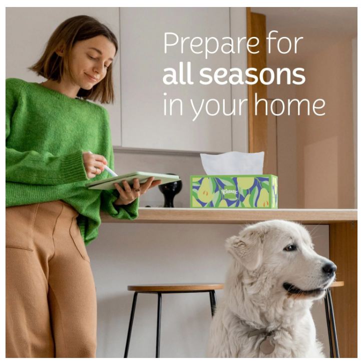 For those with the sniffles, consider trying Kleenex Soothing Lotion or Kleenex Ultra Soft facial tissues. Please note that the packaging may vary.