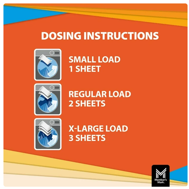 Use Instructions | Use one sheet for small, two sheets for regular loads, and three sheets for large loads. Place fabric sheets on top of wet clothes in dryer, start dryer. Remove and discard used fabric sheet after use. |