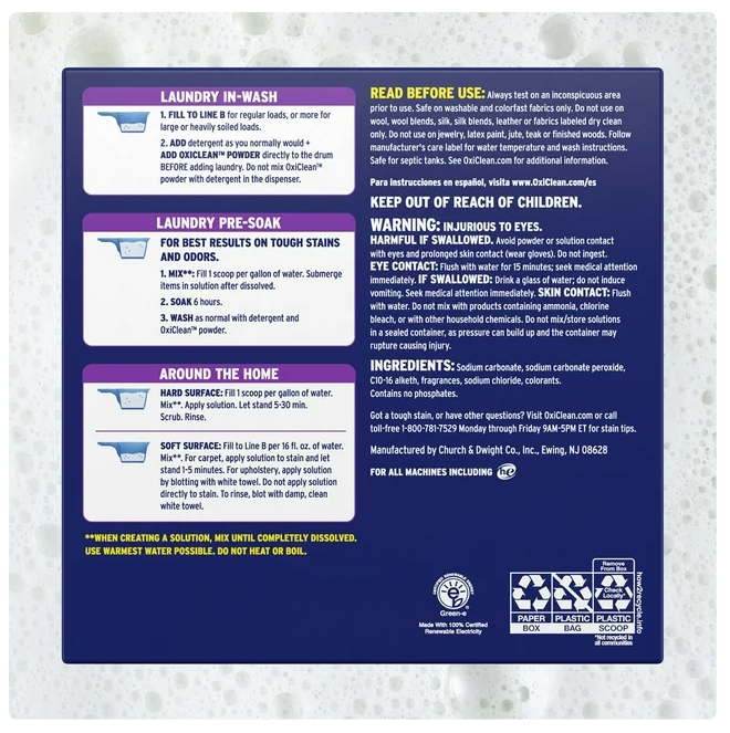 Use Instructions | In Wash: Fill to Line B for regular loads, or more for large or heavily soiled loads. Add detergent as you normally would & add OxiClean Powder directly to the drum before adding laundry. Do not mix OxiClean powder with detergent in the dispenser. Read your HE owner’s manual for instructions. Soaking Instructions: Mix: Fill 1 scoop per gallon of water. Submerge items in solution after dissolved. Soak: 6 hours. Wash: As normal with detergent and OxiClean powder. Around the Home: Hard Surface: Fill 1 scoop per gallon of water. Mix**. Apply solution. Let stand 5-30 minutes. Scrub. Rinse. Soft Surface: Fill to Line B per 16fl. oz. of water. Mix**. For carpet, apply solution to stain and let stand 1-5 minutes. For upholstery, apply solution by blotting with white towel. Do not apply solution directly to stain. To rinse, blot with damp, clean white towel. **when creating a solution, mix until completely dissolved. Use warmest water possible. Do not heat or boil. |