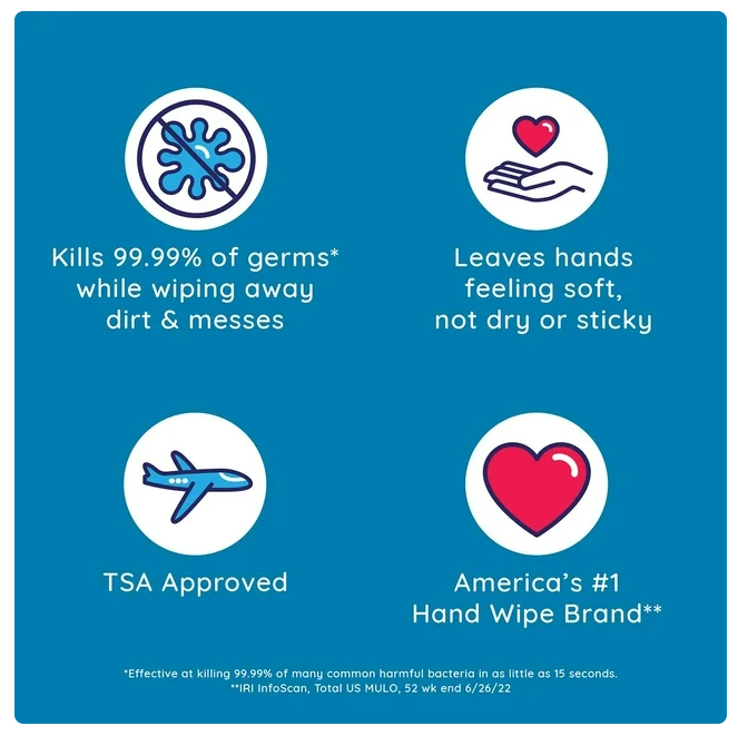 These hand wipes are tough on germs but gentle on skin, killing 99.99% of germs* while wiping away dirt and messes. They offer a reliable and effective way to keep your hands clean and germ-free, whether you're at home, in the office, or on the go.