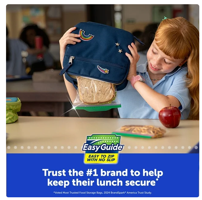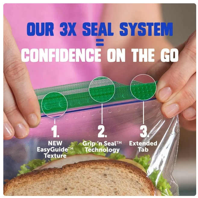 Keep your food fresh on the go with the new EasyGuide Texture on Ziploc sandwich and snack bags. This unique seal is designed to open and close with ease, ensuring a confident zip every time. With Ziploc® Brand Grip n’ Seal technology, these reusable food storage bags lock in freshness, keeping your food items tasting great.